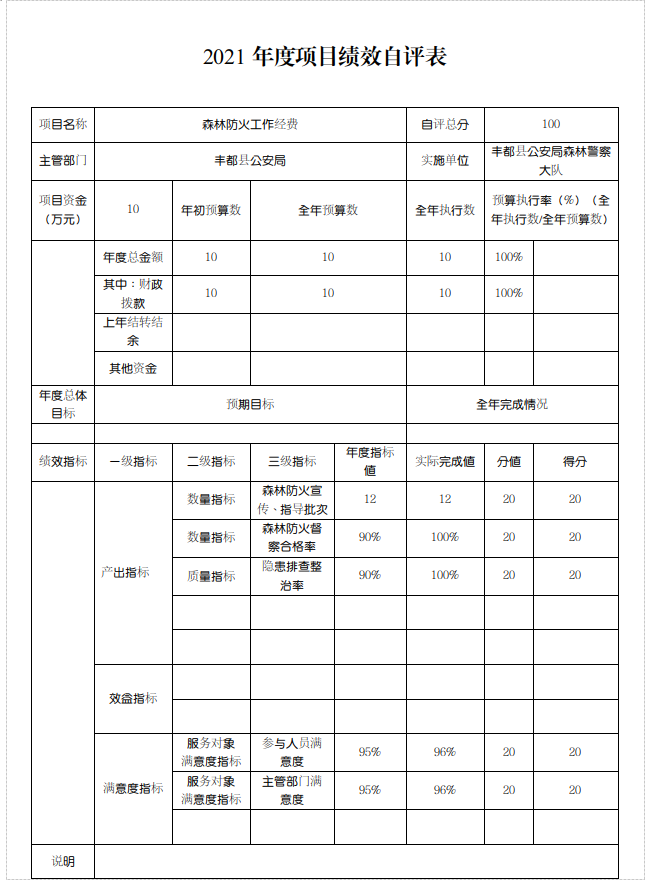 根據預算績效管理要求,本單位對4個(ge) 項目開展了績效自評,其中,以填報目標自評表形式開展自評4項,涉及資金145萬(wan) 元;以委托第三方出具報告的方式開展績效評價(jia) 0項,涉及資金0萬(wan) 元。從(cong) 評價(jia) 情況來看,項目立項較為(wei) 規範,績效目標明確,預算編製合理,管理科學規範,資金到位及時,總體(ti) 完成情況較好,有力保障了森林防火工作任務的完成,項目基本達到了預期績效目標:防火宣傳(chuan) 、指導12次,森林防火隱患排查整治100%。