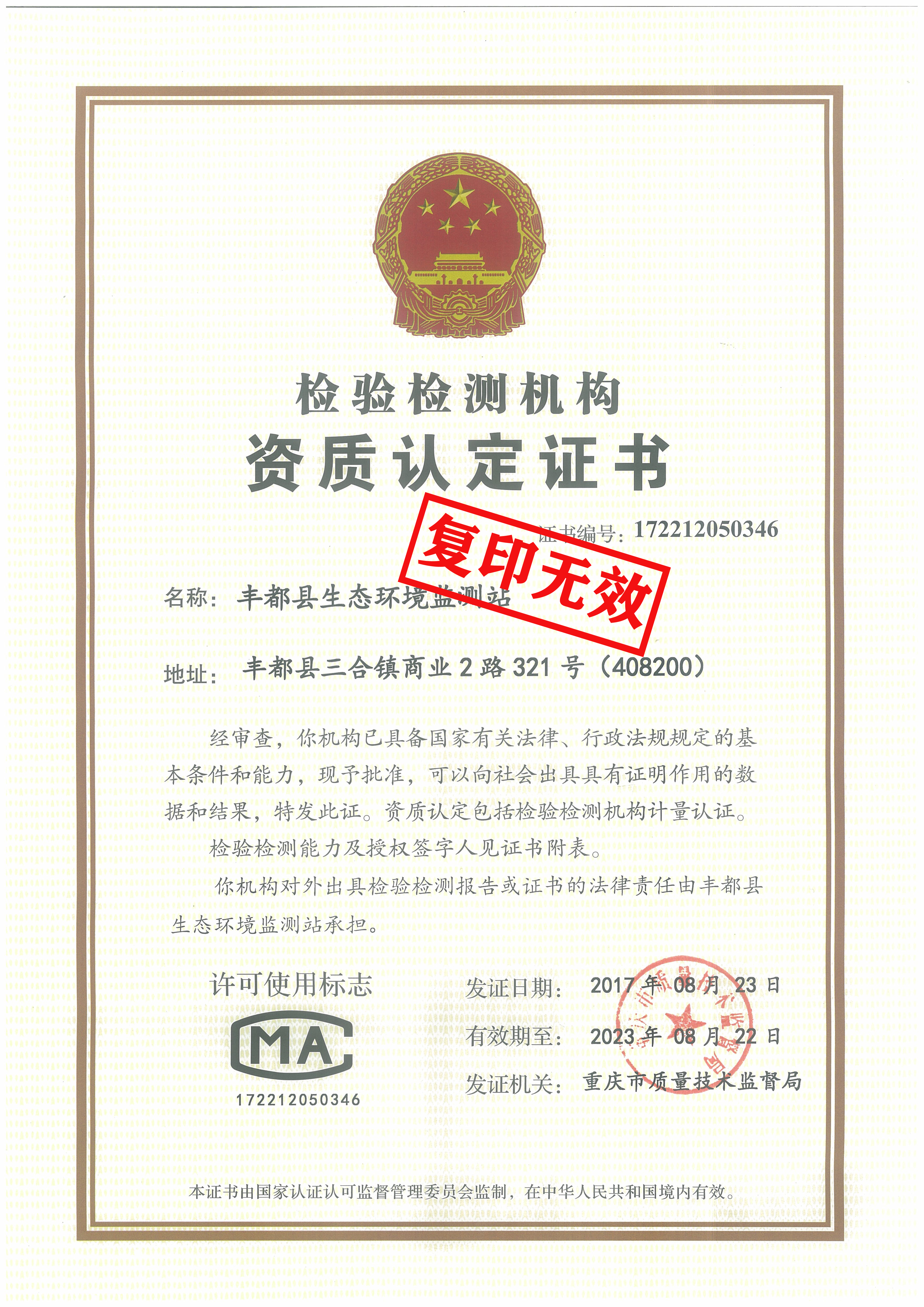 豐(feng) 都縣生態環境監測站關(guan) 於(yu) 檢驗檢測機構資質認定證書(shu) 及附表的信息公開